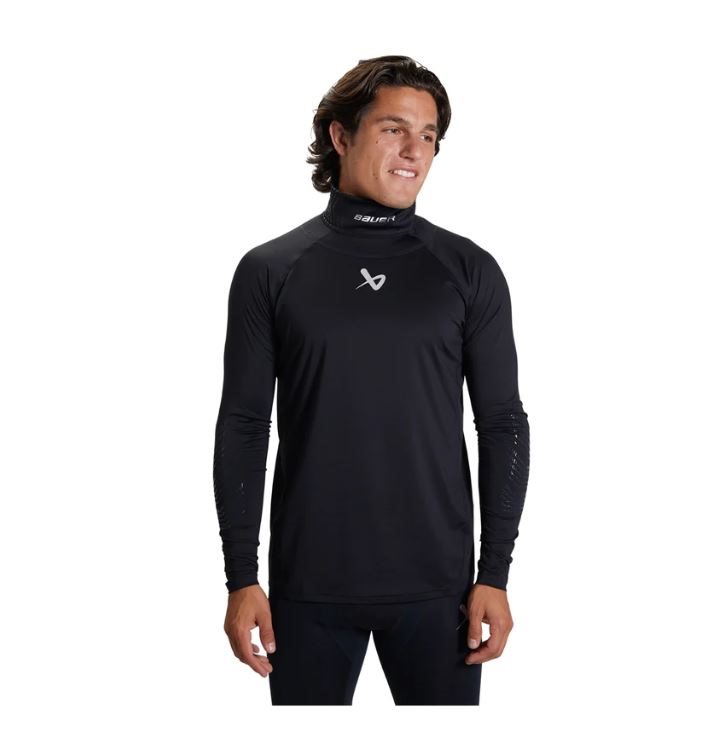 Bauer svedtrøje med integreret halsbeskytter i DuPont Kevlar® skæreresistent materiale. Flat-lock sømme for at forhindre gnidning. Nyt materiale med HeiQ Fresh teknologi forhindrer dårlig lugt forårsaget af bakterier. HeiQ Smart Temp teknologien hjælper også med at regulere kropstemperaturen. På albuerne sidder printede grebszoner, som holder dine albuebeskyttere på plats.